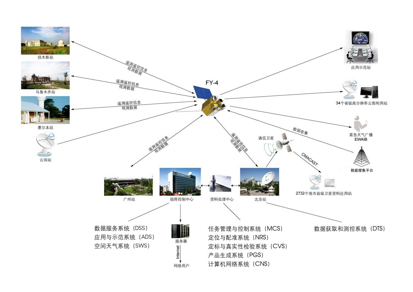 地面应用系统中的数据获取和测控系统、任务管理与控制系统、定位与配准系统、定标与真实性检验系统、产品生成系统、计算机网络系统等系统建在北京气象卫星地面站内。数据服务系统、应用示范系统、空间天气系统建在国家卫星气象中心大楼内,在大楼的二层机房内建有卫星运行指挥控制中心,对我国在轨运行的极轨和静止气象卫星进行状态监视、任务管理、应急处理及指挥控制。在广州站建设包括数据获取和测控需要在科研试验卫星阶段进行验证的部分系统,在业务卫星发射前进行扩充建设。