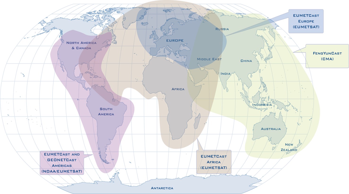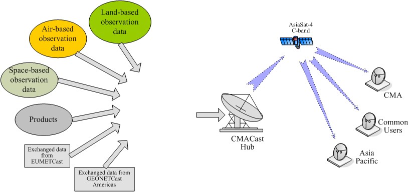 CMACast is a component of the GEONETCast, a near real time, global network of satellite-based data dissemination systems designed to distribute space-based, air-borne and in situ data, metadata and products to diverse communities. GEONETCast is led by three regional infrastructure providers: EUMETSAT in Europe (EUMETCAST), NOAA in the Western Hemisphere (GEONETCast Americas), and China Meteorological Administration (CMA) in the Asia-Pacific region (CMACast). The full operation of GEONETCast is expected to provide quick, affordable, globally accessible data delivery service to users.