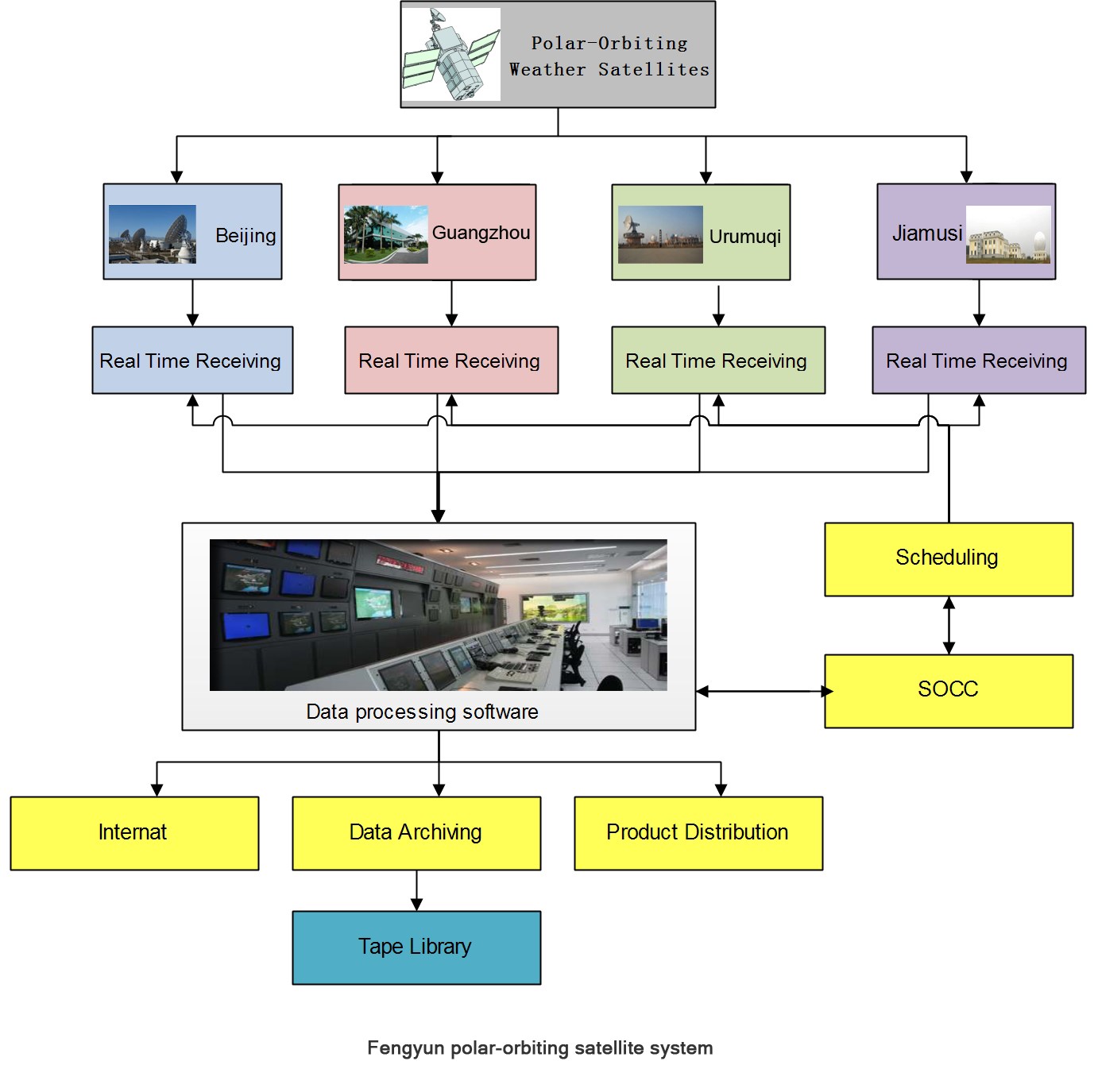 NSMC operates four polar-orbiting-satellite ground receiving stations in Beijing, Guangzhou, Urumuqi, Jiamusi, respectively. They receive FY-3 L-band and X-band data transmission and relay the data through optical fiber link to Beijing Data Processing Center. According to the contract between CMA and SSC (Sweden Space Center), the latter uses its Kiruna station to receive data dump from FY-3 satellite and re-transmits the data to the Beijing DPC.