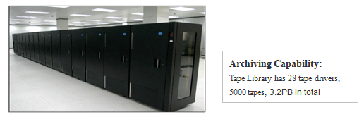 The main technical subsystems are physically located in NSMC building, which are featured by the mainframe computer with calculating capacity up to 10 trillion floating-point operations per second, a disk array of storage capacity of 360TB, and an automated tape library that can store 2.5PB of data. The system is accessible to both 10-gigabit highway and gigabit branches.