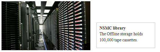 At NSMC, data is stored in three levels, namely, online, near-line, and off-line. The data stored on the disk array that constitutes the file system is the Online Archive. The Near-line Archive is the data stored in the automatic tape library. The Offline Archive is the data stored on the tapes off the automatic tape library and preserved elsewhere in the NSMC building.